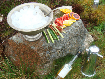 Stir over rock ice and garnish with seasonal fruit (if possible garnish with gorse flowers).