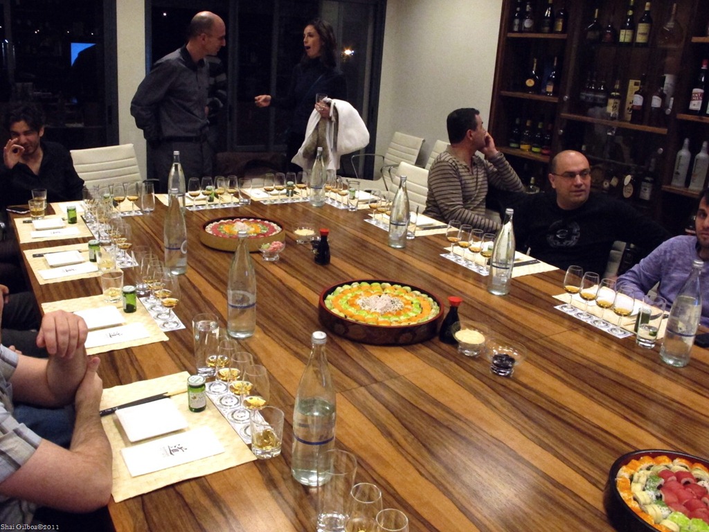 After the nice welcome, we went upstairs to the meeting room were a rather large table was set with whisky sampling glasses (copita look-a-like glasses) per each attendant, three large bowls with lots of sushi (by Sushido restaurant in Tel Aviv; link to Google Translate as original site is Hebrew), of course all relevant sushi related “spices” (wasabi, soy sauce, ginger and so on) and also a small sample of Choya Umeshu liquor for each of us.