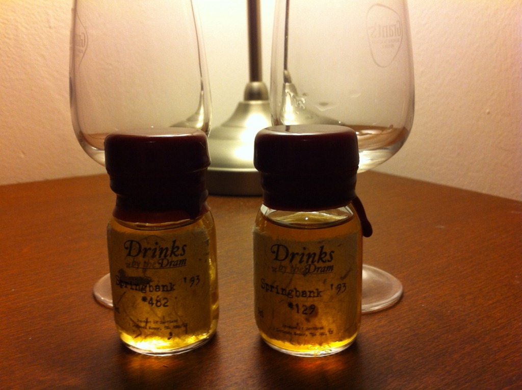 photo (3)A week ago I got a letter from Ben of Master of Malt (the brain behind many great whisky things that are going on at MoM) asking me for my help in tasting two different springbank samples. They are looking to bottle a single cask, and they got some nice samples from 2 such casks they wanted to share and let a few whisky geeks/ bloggers to try and say what they think should be bottled. All the information they divulged was that they were both 1993 casks, and only one can be bottled because of certain machinations of the bottling deal. Thanks to the ever so sluggish Israeli mail, it took those babies a further week to get here, and when I got hold of them yesterday I was ready and able for the mission. The sacrifices we do for whisky 😀 . I cant’ complain. Springbank with their maritime, salty profile with a wee bit of sherry added is something of beauty, and I was really looking forward to tasting those wee samples.