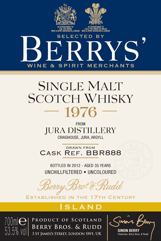 Berry’s own Isle of Jura 1976, 35 yo ,53.5% abv . Bottled 2012 , £195