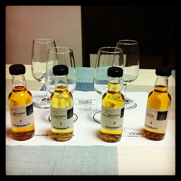 So, Grain whisky. It’s a well kept secret, but Single Grain whisky can be amazingly good. I’ve been advocating single grain for some time now, reviewed a few samples but I still felt i needed to try more, and what a better opportunity than to try it at one of Steve’s Twitter tastings and Arkwrights Whisky and Wines , who were kind enough to send everyone 4 samples of lovely grain whiskies (blind of course), to try last Wednesday.
