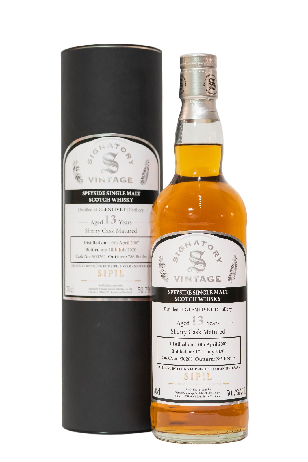 Sipil is the local importer for Signatory whisky, to Israel and for their 5th Anniversary as a Business, they have bottled a single cask Glenlivet for the local market. This whisky was distilled in April 2007 and bottled July 2020 making it 13 years old. Cask # 900261 yielded 786 bottles at 50.7%. The whisky is available only locally in Israel.